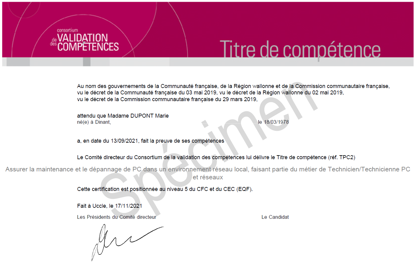 Elle permet d’obtenir un Titre de compétence, une certification officielle délivrée au nom des gouvernements de Belgique francophone. Ce Titre est reconnu par les principaux opérateurs de l’emploi, de la formation et de l’enseignement professionnel : Le Forem, Bruxelles Formation, IFAPME, SFPME et l’Enseignement pour Adultes.