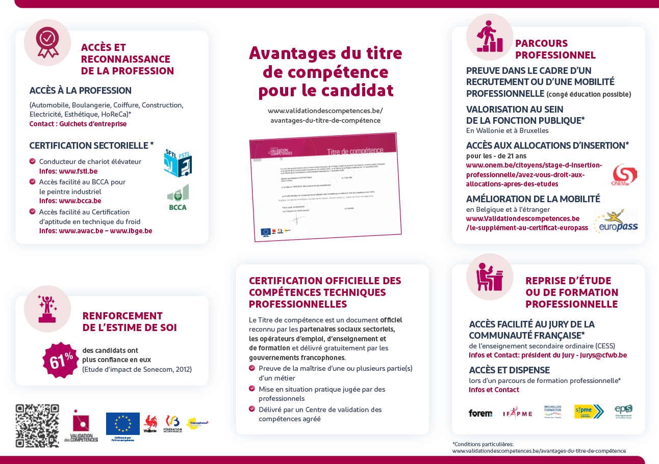 Le Titre de compétence est une certification légale, délivrée au nom des gouvernements francophones et reconnue par les opérateurs de l’emploi, de la formation et de l’enseignement. La démarche est gratuite, volontaire et sans condition de diplôme.